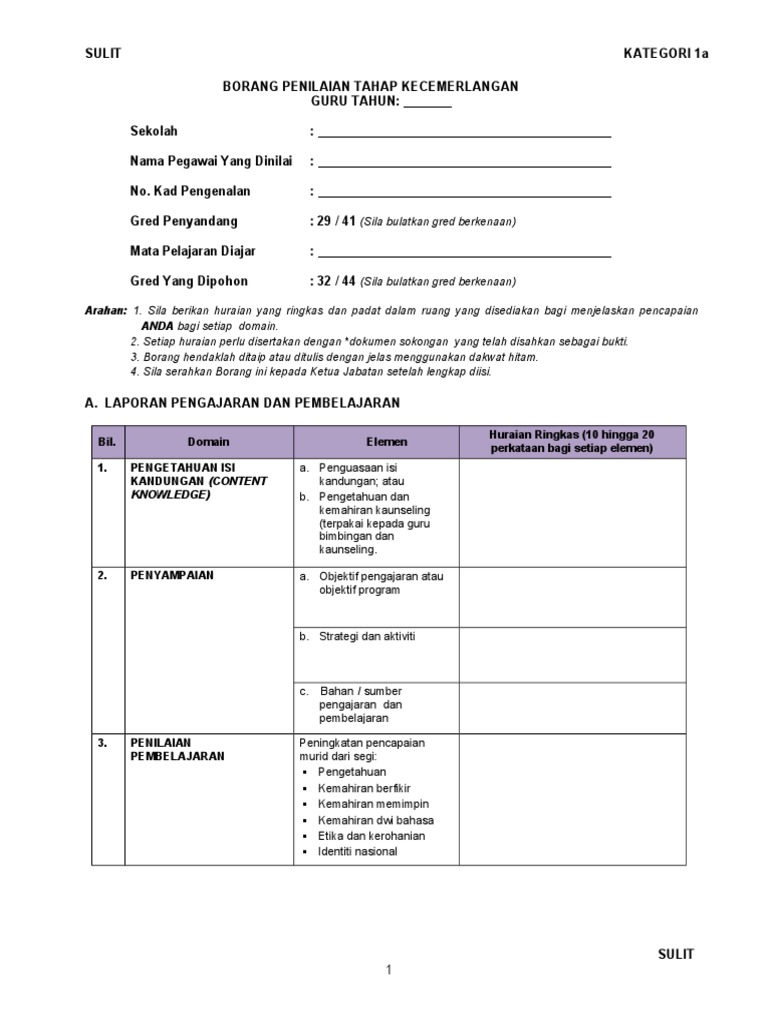 (a) pegawai perkhidmatan pendidikan (ppp) gred dg32 hingga gred dg54 5 + 3 = 8. Alamat permohonan permohonan yang lengkap hendaklah sampai ke alamat berikut: Selasa 10 sep 2013 06:11: Dengan hormatnya perkara di atas adalah dirujuk. Sk merang nama pegawai yang dinilai. Calon gagal urusan kenaikan pangkat 1. Sulit kategori 1b borang penilaian tahap kecemerlangan guru tahun. Selasa 10 sep 2013 06:12: Cara mengisi borang kenaikan pangkat dg41 ke dg44. Tempoh kenaikan pangkat secara kup telah dipendekkan daripada 15 tahun kepada 13 tahun. Borang permohonan & penilaian pemangkuan/ kenaikan pangkat berasaskan kriteria kecemerlangan (kc) bagi skim perkhidmatan pegawai latihan vokasional (plv)/ penolong pegawai latihan vokasional (pplv), perkhidmatan gunasama persekutuan bahagian a: Guru guru yang layak untuk kenaikan pangkat time base boleh muat turun borang borang berkenaan mengikut kategori masing masing.
