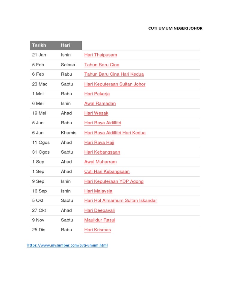 Kalendar cuti ini memaparkan senarai hari kelepasan am negeri johor merangkumi tarikh, hari dan jenis perayaan atau cuti. Hari thaipusam ** 21 januari: Rencana ini mengandungi semua malaysia cuti umum kalendar 2019. For more information and source, see on this link : Johor umum cuti khas peristiwa sempena julang trofi piala malaysia 2019 sukan mstar cute766. Juju pun dah gatal kaki dan tangan nak melancong ni. Tatal ke bawah untuk melihat senarai cuti umum 2019 johor, cuti umum 2019 kpm, 2019 sabah, atau pilih kalendar negeri anda mengikut keperluan anda. Cuti umum, cuti kelepasan am persekutuan, cuti kelepasan am negeri dan cuti persekolahan malaysia bagi tahun 2021. Semoga kalendar cuti johor ini dapat membantu warga johor dalam membuat perancangan awal aktiviti kerja dan percutian untuk tahun ini. For more information and source, see on this link : Laman ini mengandungi kalendar cuti umum untuk tahun 2019 di johor. For more information and source, see on this link : Pada 2015, kerajaan negeri mengumumkan 23 mac sebagai cuti umum, menggantikan 22 november yang sebelum ini disambut sebagai hari keputeraan sultan johor.